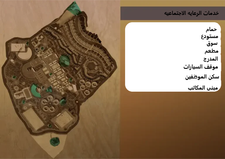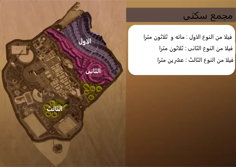 القرية السكنية ٣: يُركز هذا القسم على إعادة إحياء تجربة الحياة البدوية والطبيعية. استُلهمت أماكن الإقامة المؤقتة والخفيفة الوزن من خيام البدو والهياكل الخفيفة الصديقة للبيئة، لتوفر للسياح تجربة فريدة من نوعها تجمع بين تناغم الطبيعة وبساطة الحياة البدوية.