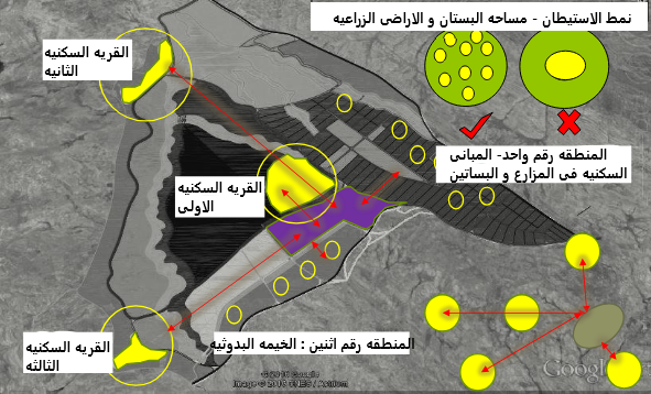 القرية السكنية ١: تُركّز القرية على السكن بالقرب من المزارع والبساتين، ويعتمد تصميمها على الحفاظ على أصالة الريف واستخدام المواد المحلية. تقع المنازل والفلل في مساحات متناثرة بين الأراضي الزراعية، مما يُحافظ على تواصل مباشر بين السكان وعملية الإنتاج والبيئة الطبيعية.